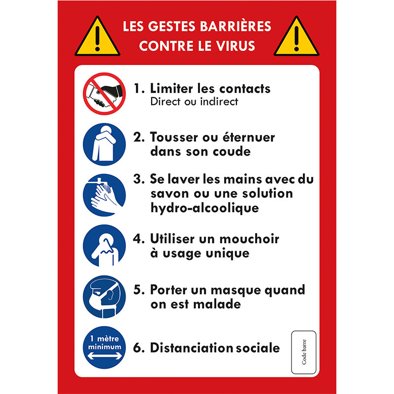 AFFICHE ADHESIVE PRETE A POSER DE FORMAT A4 LISTANT LES GESTES BARRIERE A RESPECTER EN TEMPS DE PANDEMIE