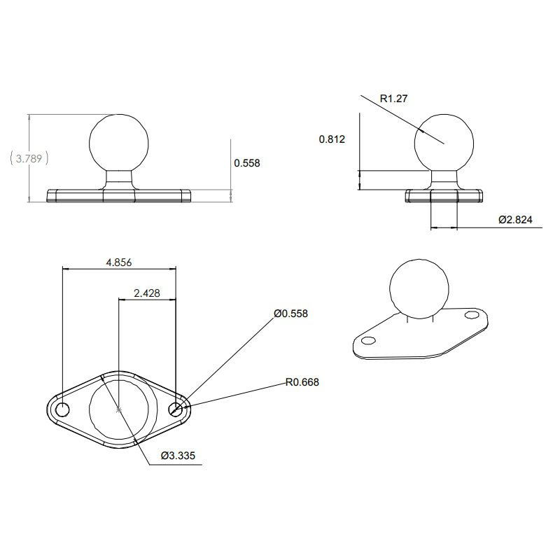 BASE DE FIXATION LOSANGE AVEC 2 PERCAGES AVEC BOULE DIAMETRE 1" (2.54CM)