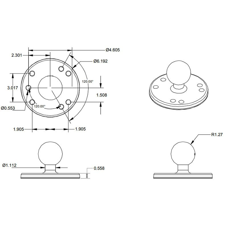 BASE DE FIXATION RONDE PERFOREE DIAM. 6.35CM AVEC ROTULE DIAMETRE 1" (2.54CM)