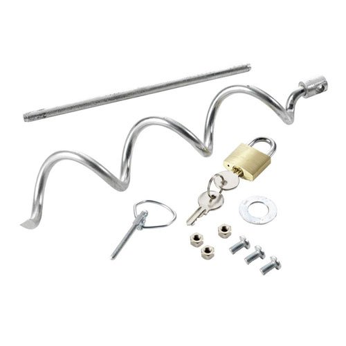 • Le kit se compose de: ancrage de sol en spirale (27 cm) avec aide au vissage et boulon de sécurité, cadenas et vis de montage et écrou de sécurité.