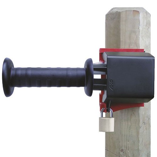 - Ce kit comprend: isolateur PVC avec plaque de fixation inox, poignée avec limitation d'étirement, boitier de sécurité, 2 vis de fixation, cadenas laiton.