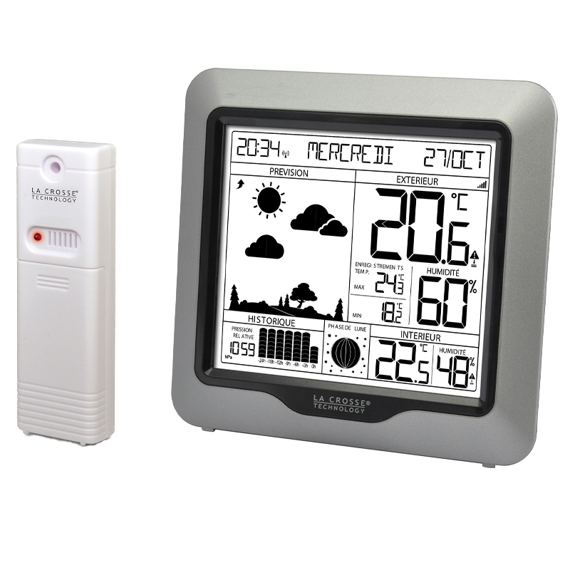 Données affichées: heure, date, température et hygrométrie intérieures et extérieures, indice de chaleur et point de rosé, prévisions météo, pression atmosphérique et phases de lune