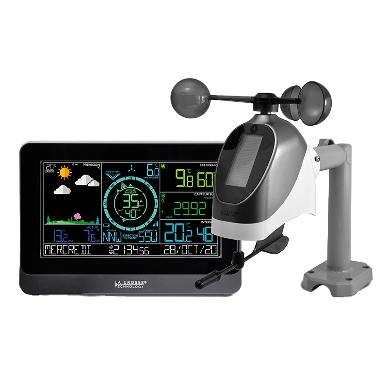 Données affichées: heure, date, température et hygrométrie intérieures et extérieures, prévisions météo, vitesse et direction du vent, pression atmosphérique